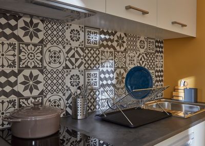 À des carreaux de ciment que l'on retrouve au sol et en crédence.