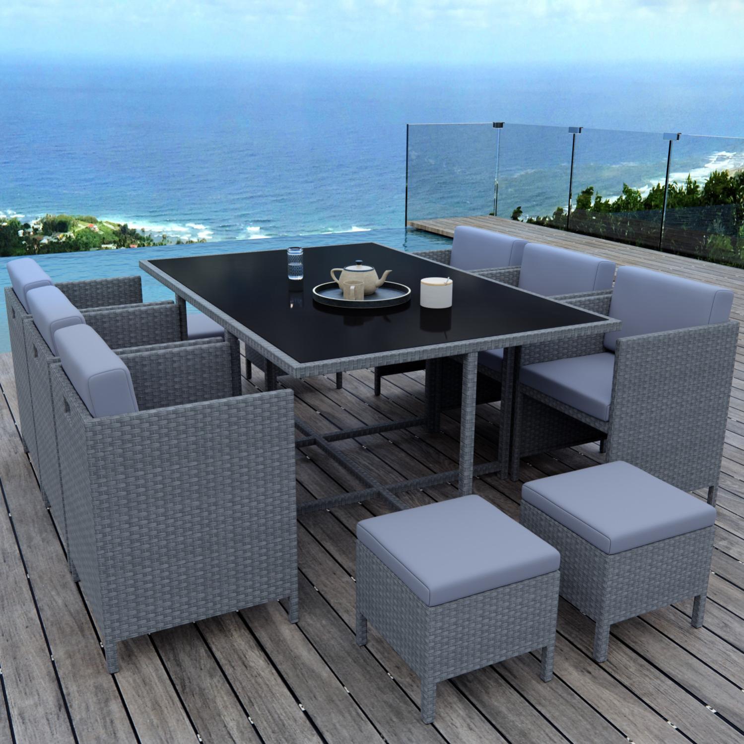 Les courbes aux effets cocon séduisent les propriétaires de terrasse, de jardin et de véranda. Ses coussins épais et ses dossiers rembourrés en font un salon de jardin aussi agréable qu'un canapé d'intérieur. Salon de jardin 8 places avec dossiers chocolat et housse resine tressee. Table de salon de jardin avec touret. Un choix unique de salon de jardin resine tressee gris disponible dans notre magasin. Salon de jardin anzio en r sine tress e noire coussins gris resine tressee. Et vous pouvez aussi acheter les éléments séparément. Côté pratique, les poufs sont encastrables sous les chaises : Des matériaux de qualité pour une durée de vie exceptionnelle. Caractéristiques de la table :