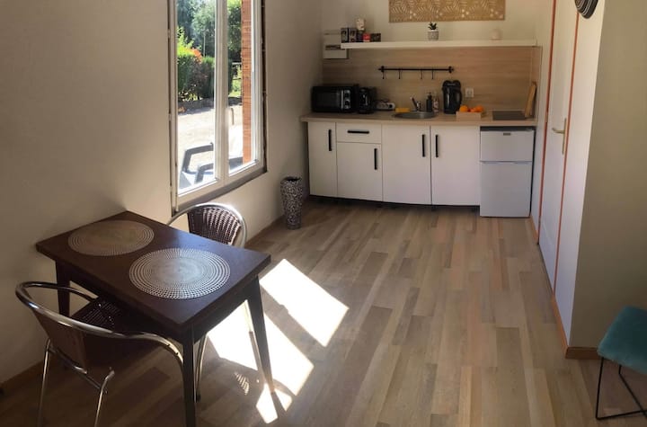 Pool house avec salon de jardin transats et bains de soleil dans un jardin de 1000 m² arboré et paysagé à l'abri des regards.